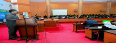 Kamishna wa Tume ya Utumishi wa Umma, Dkt. Laurean Ndumbaro (aliyesimama) akizungumza wakati wa kikao na watumishi wa NEMC alipozuru Ofisi za Baraza 23 Oktoba, 2025 ikiwa ni ziara yake ya kik